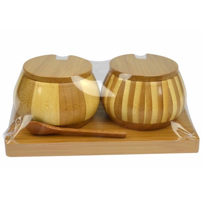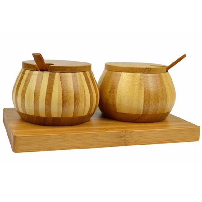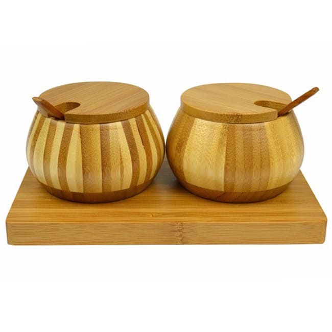Bamboo Caster Set Funciones: Incluye 2 bowls con tapa, 2 Cucharas y Base